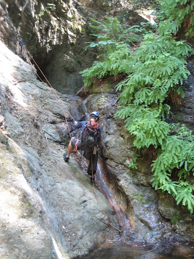 Nowadays, after the Station Fire and the debris flows that followed, much of Vasquez is downclimbable. The West fork of Vasquez creek is a nicer descent, and just as shady. The trail from Big T is hard to find if you don't know where it is, but once you get about 400 ft above the river bed you'll cross two tributaries to Vasquez. Drop into the last one before the Grizzly Flat plateau (the final 100 yards or so is partially blocked by a tree) and follow it down. Not as many rappeals along the way, but the final 300 ft cascade (navigable by two or more staged drops with rock anchors) is worth the trip. It will put you at the base of the last rap in Vasquez proper.